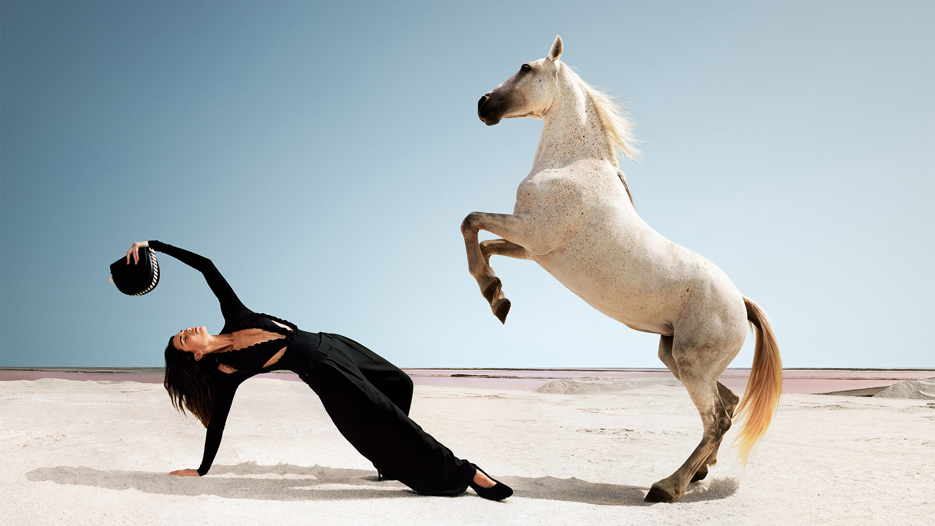 With the Horse Power theme, the luxury campaign was shot by Harley Weir, a London-born photographer, in Camargue Salt Flats. On the plains of Southern France, one can see Jenner channeling her inner affection for horses, posing like a horse girl. Moreover, horse whisperer and rescuer Jean-Francois Pignon provides the region’s famous white ponies for added flair.