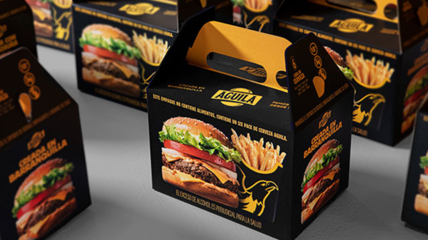 In partnership with Rappi, the largest food delivery app in Colombia, Aguila is delivering six-packs disguised in fast-food style packagings, such as a cheeseburger meal, pizza or fried chicken. The idea is to trigger a food craving just as people prepare to drink, in order to make sure they eat something as well.