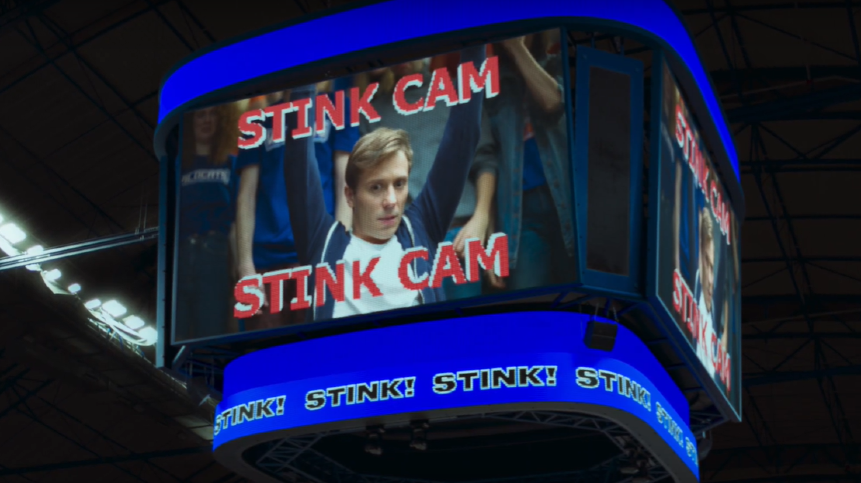 The brand advertisement features a guy watching a basketball game at a stadium imagining his body odour has caused a panic in a basketball arena, landing him on the ‘stink cam’, prompting the crowd to faint and flee as aeroplane-style oxygen masks drop down for people on the court.
