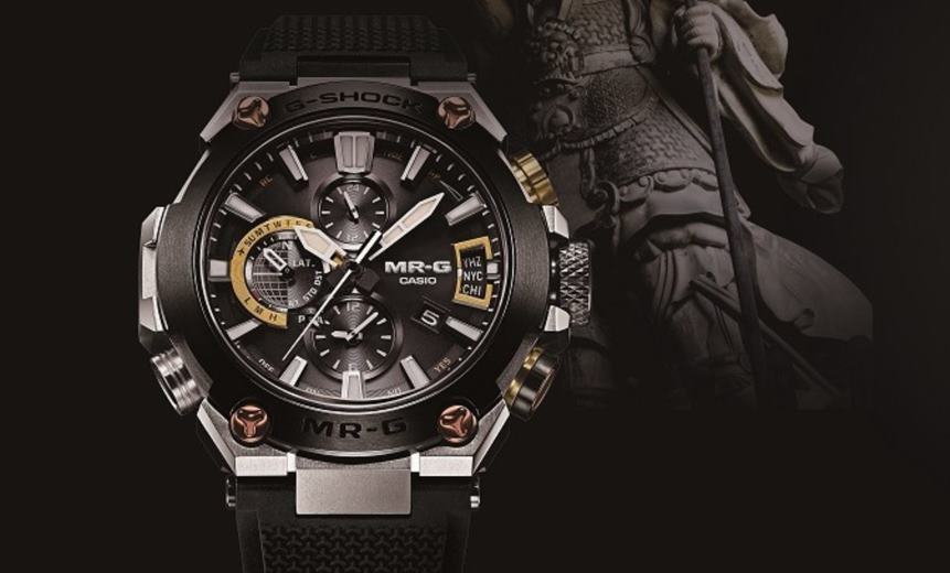 The new Casio MRG-G2000R-1A timepiece features a traditionally Japanese Bishamon-kiko pattern on a Dura Soft Fluoro-rubber Band.