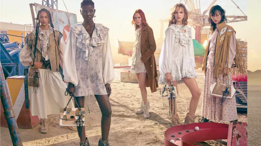 Completing the talent lineup are Adut Akech, Sora Choi, Indira Scott, Fran Summers, and Kiki Willems. Set against a carnivalesque desert backdrop while inspired by road trips out west, the label dresses the women in floral print dresses, salvaged heirlooms, and more.