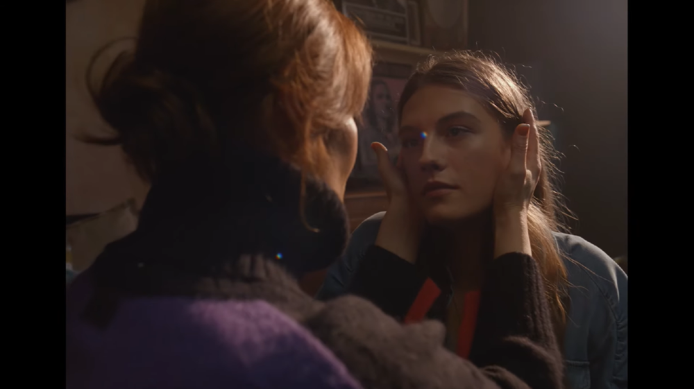 In the short, Francesca is played by model and activist Harlow Monroe. Rousselet tracks Francesca’s transition over time, and the viewer sees Monroe embracing herself as she comes into her true identity. Throughout the vignette, a Christian cross motif appears—including from the very first scene, as a pendant.
