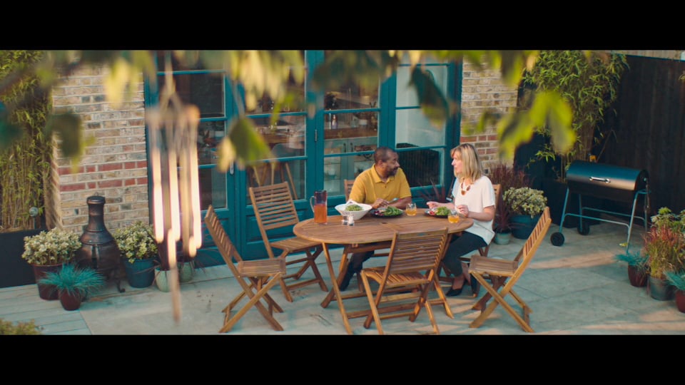 The advert shows a couple enjoying the last of the summer sun, eating outdoors. But in true British style, as the rain clouds draw in, they retreat indoors, where they relax in their Homebase kitchen.