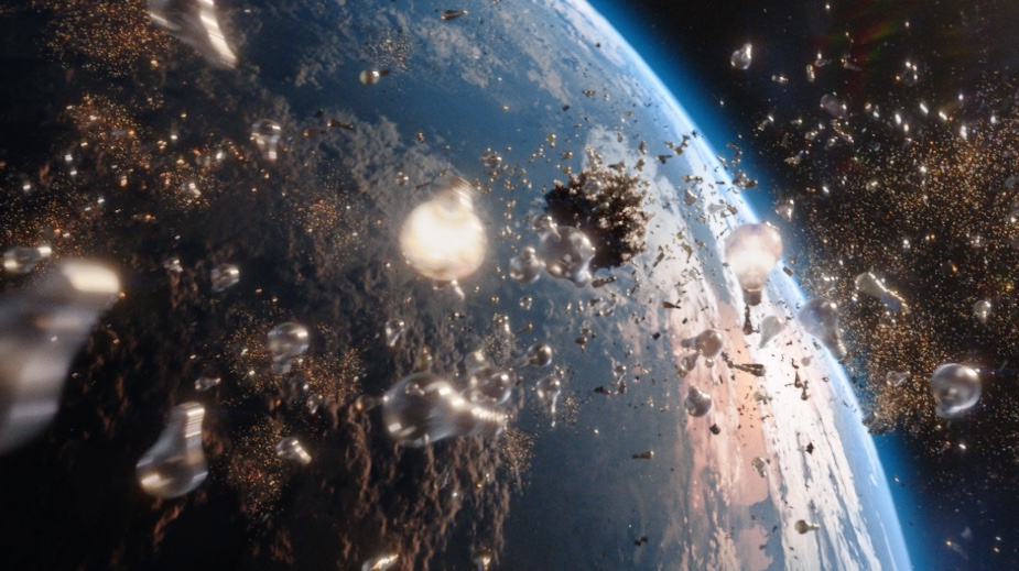 Indeed, the more positive actions made on earth, the more the meteor disintegrates. The girl’s father cleaning vegetables over a washing up bowl, whilst his son sits on the counter picking fresh herbs. Meanwhile, her mother replaces an old filament bulb with an eco-friendly LED one, whilst another man hangs his washing on a drying rack. A student upcycles an old chair while drinking from a reusable cup, causing disposable coffee cups to break free from the meteor and fly through the air, spilling the last drops as they go.