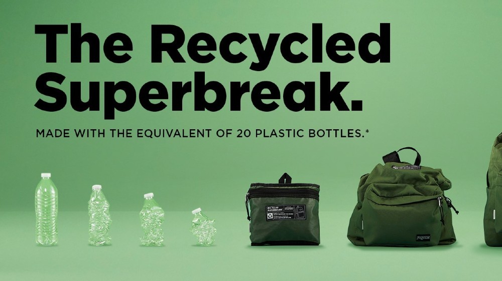 The JanSport Recycled SuperBreak, each containing the equivalent of 20 plastic water bottles worth of recycled plastic, uses 900 Denier Polyester Cordura eco-fabrics, made of postconsumer waste such as plastic water and soda bottles.