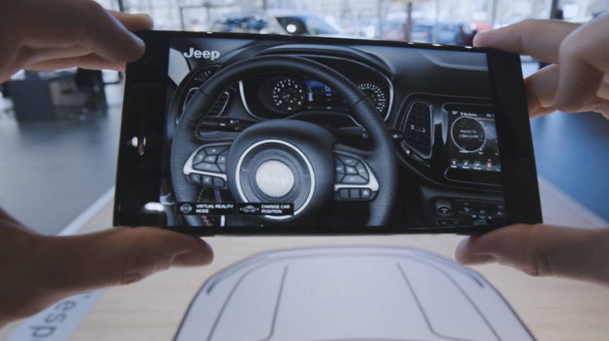 The Jeep Compass Visualiser allows car buyers to hold a Tango-enabled device and view, walk around, look inside and configure a life-size virtual car. External colours and wheel options can be selected and interchanged. Doors can be opened to reveal a realistic and detailed interior, where changes to upholstery colours can be made with a tap on the device screen. As the car is viewed through the device, the virtual car moves in relation to how the user moves.