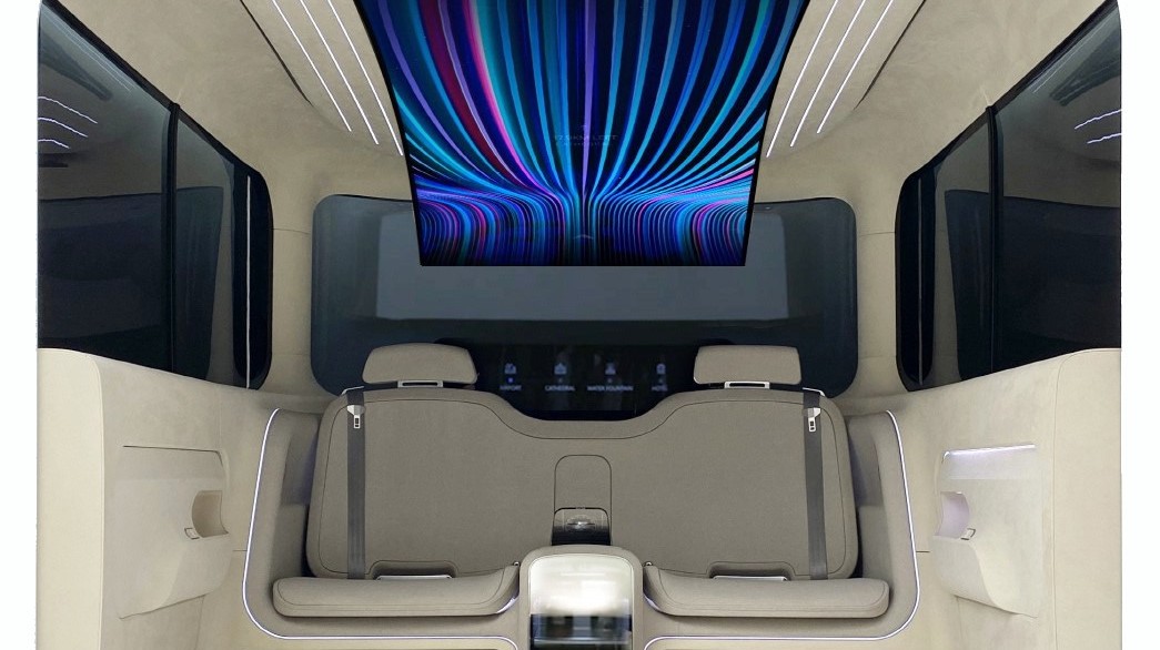The giant 77-inch OLED screen can be split to allow both rear passengers to enjoy different content simultaneously. Headrest speakers create a personal sound zone that doesn’t intrude on the other passenger.