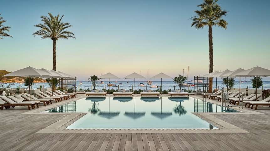 Nobu Hotel Ibiza sits on the shores of Talamanca Bay and features 152 rooms and suites, two private seafront pools, a spa, the Nobu Restaurant Ibiza, several other restaurants, and boutique shopping. Suited to couples and families, the design reflects idyllic luxury.