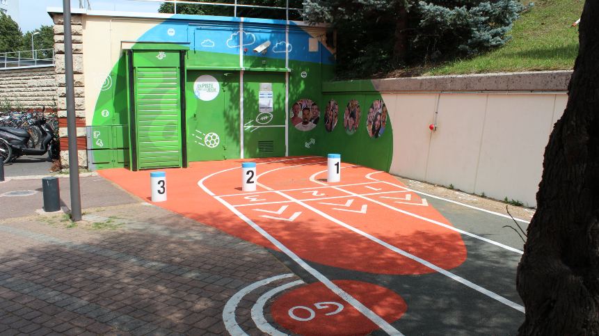 The Stade des Mureaux is an athletics track outside the “La Gare des Mureaux” station which draws on the French love and respect for all kinds of sports, with murals designed to give the feel of a sports stadium outside the station, complete with life-like spectators. The theme was continued inside with active life-size athletes. An optical treatment of large round bubbles was used to disguise the corners that were being used for urination.