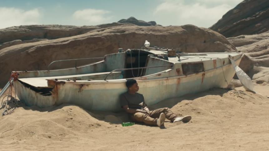 Picking up where the rapper’s last ‘stranded at sea’ themed video, Big Fish, left off, Staples’ new video has him stranded in a desert with only an empty Sprite bottle to guide him, which he spins to escape the desert. He finds refuge at a diner and enjoys his favourite drink.