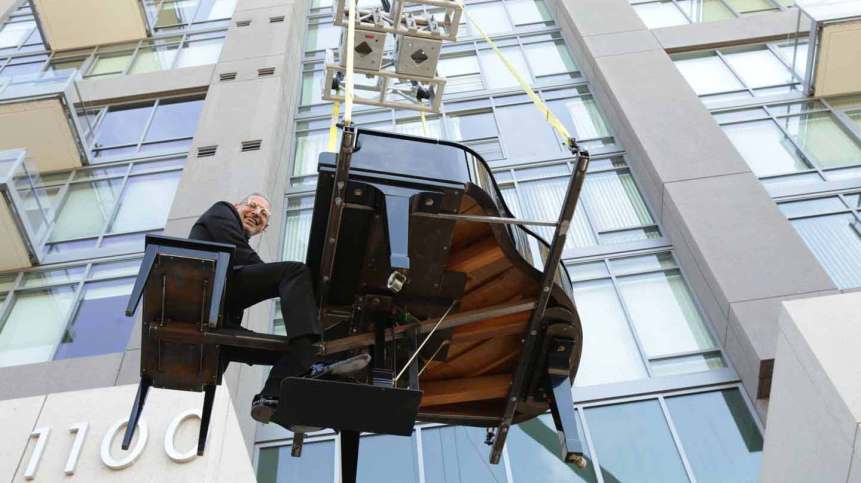 Bellflower commandeers a piano about to be moved into an apartment and launches into a rendition of the aforementioned hit as he’s craned upward to a ‘deluxe apartment in the sky’. Upon reaching the penthouse, he meets its inhabitants: a reimagined George (George Washington) and Weezy (Lil Wayne).