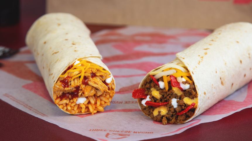 The first combines seasoned rice, shredded chicken, a red sauce, sour cream, and cheddar cheese in a hot tortilla wrap. Next is a three-cheese sensation featuring seasoned beef, a nacho cheese sauce, red tortilla strips, and sour cream. Also, classic flavours add appeal.